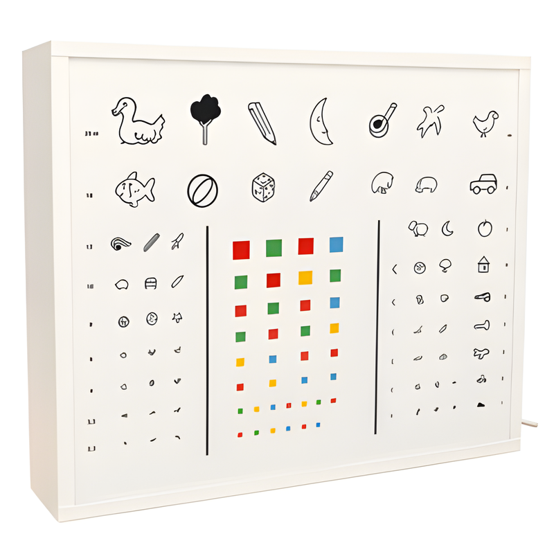 Realizzato in lamiera di acciaio smaltata, offre resistenza strutturale e facilità di manutenzione negli ambienti sanitari. Incorpora illuminazione fluorescente e uno schermo in metacrilato con serigrafia adatta ai bambini , appositamente progettato per facilitare l'identificazione delle figure durante l'esplorazione visiva.