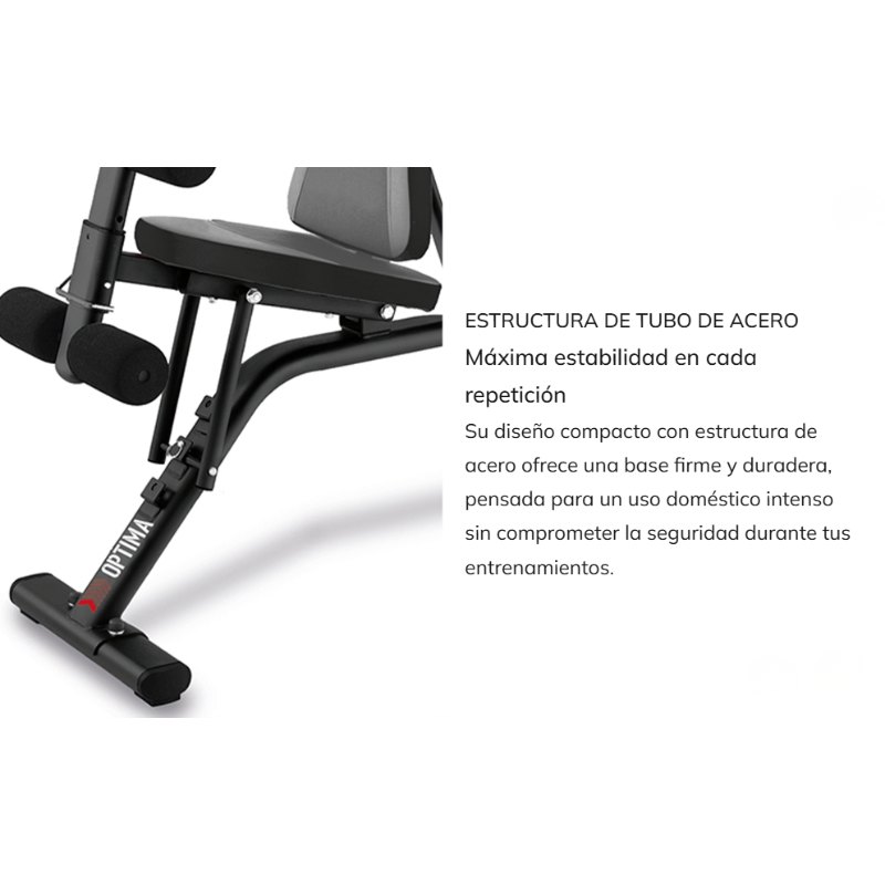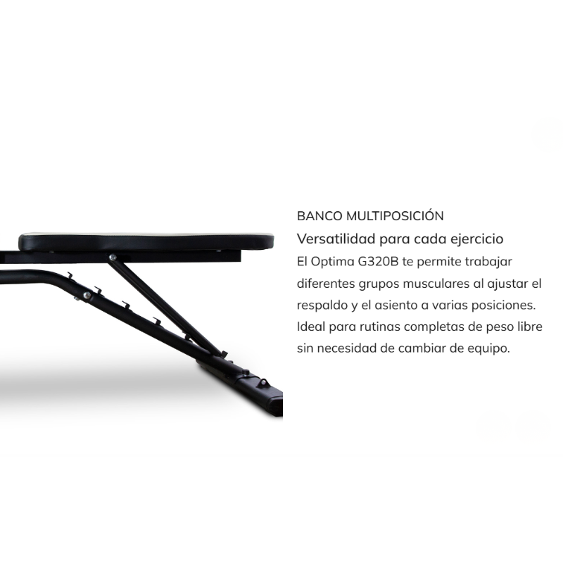 La Optima G320B è una panca pesi multiposizione progettata per l'allenamento di forza a casa. La sua struttura compatta e robusta consente un allenamento con pesi liberi sicuro e confortevole, adattandosi a diversi esercizi grazie allo schienale, al sedile e al supporto per le gambe regolabili . È la soluzione ideale per chi cerca una panca versatile per allenamenti completi senza occupare troppo spazio.