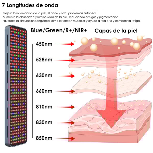 - Lunghezze d'onda multiple : include luce blu, verde, rossa e infrarossa per diversi approcci (benessere, vitalità e trattamento dei tessuti).