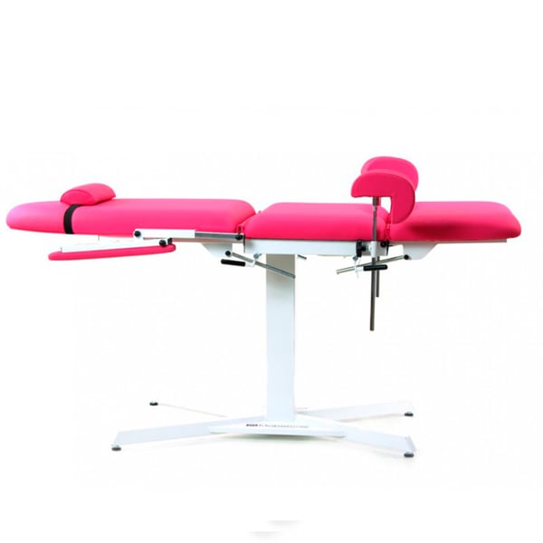 Poltrona ginecologica a tre sezioni ad altezza fissa . Include supporti ginecologici per le gambe, un vassoio rimovibile in acciaio inossidabile, braccioli pieghevoli per facilitare l'accesso laterale e un cuscino cervicale ergonomico .