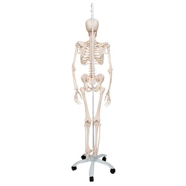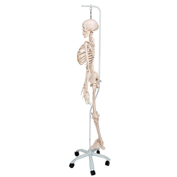Le ossa della mano in questo modello di scheletro sono state montate su fili per consentirne la visualizzazione nella loro posizione naturale. Il montaggio flessibile delle ossa del piede serve solo per la tua mobilità. Le scapole ruotano quando le braccia sono sollevate . Con questo modello è possibile dimostrare anche una mobilità ridotta dell'osso sacro e del bacino.