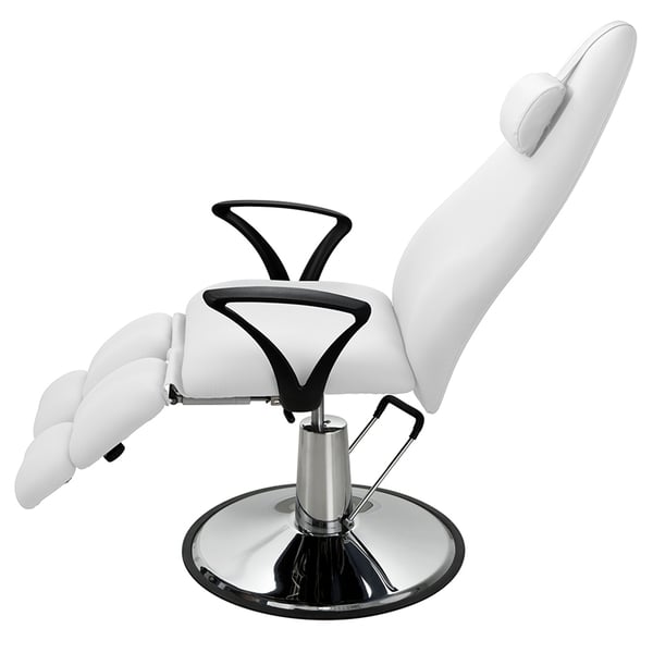 Poltrona podologica girevole con altezza regolabile tramite pompa idraulica, schienale e poggiapiedi regolabili indipendentemente tramite pistone a gas.