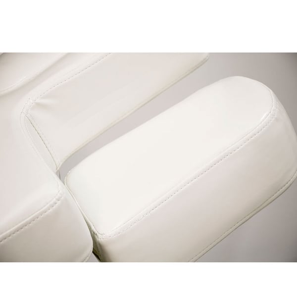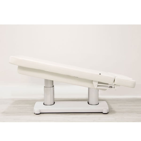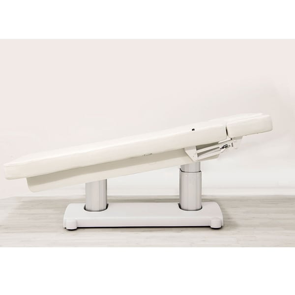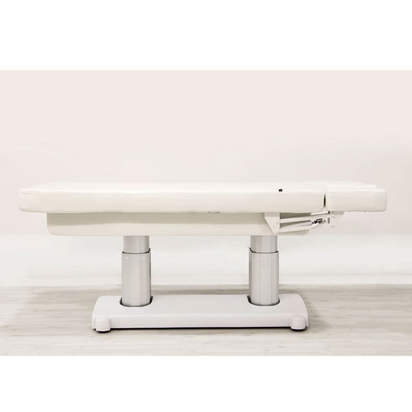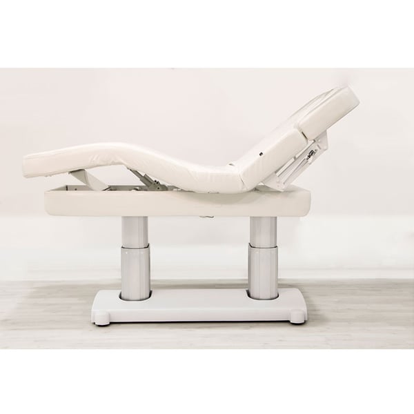 Barella SPA con 4 motori che regolano l'altezza e l'inclinazione dello schienale, del poggiapiedi e dell'intera barella. Imbottitura ad alto comfort con rivestimento in PU bianco di alta qualità. Materasso monopezzo a 3 sezioni. Braccioli regolabili e poggiatesta con foro facciale.