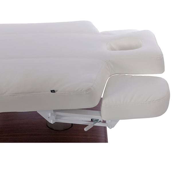 Ha braccioli regolabili e testiera con foro frontale, la sua struttura è metallica con finitura in legno naturale o scuro e la sua imbottitura ultra morbida di grande comfort con rivestimento in PU bianco è di alta qualità.