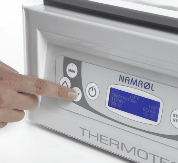- Il pannello di controllo digitale con schermo LCD consente il pieno controllo di tutte le funzioni quali: regolazione individuale della temperatura, del tempo e del livello di vuoto e regolazione dei tre programmi di lavoro incorporati.