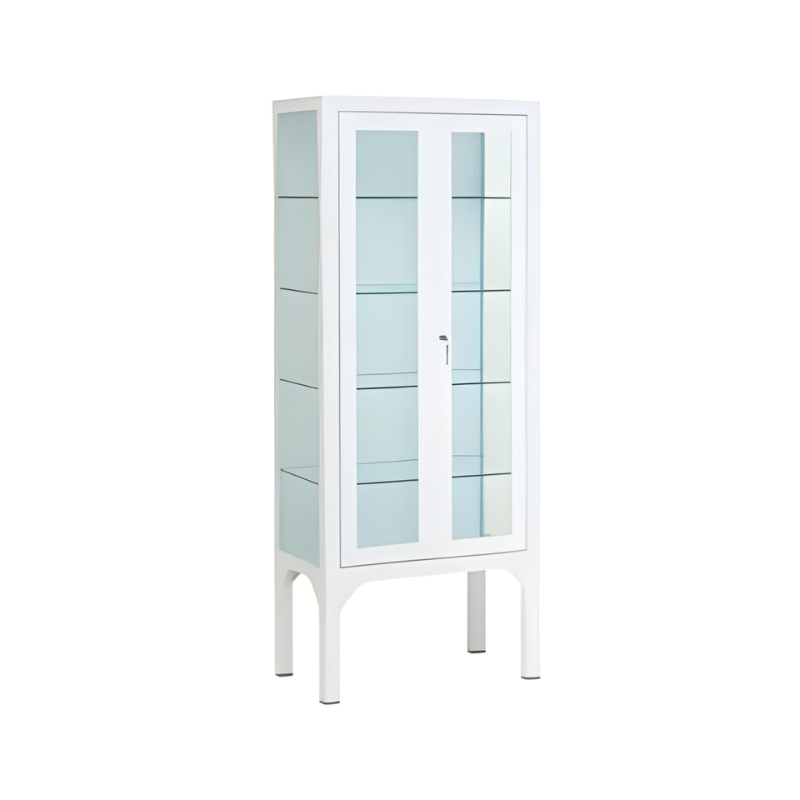L'armadio espositivo clinico in acciaio smaltato a 2 ante è un mobile progettato per conservare in modo sicuro e organizzato strumenti medici e materiali clinici.